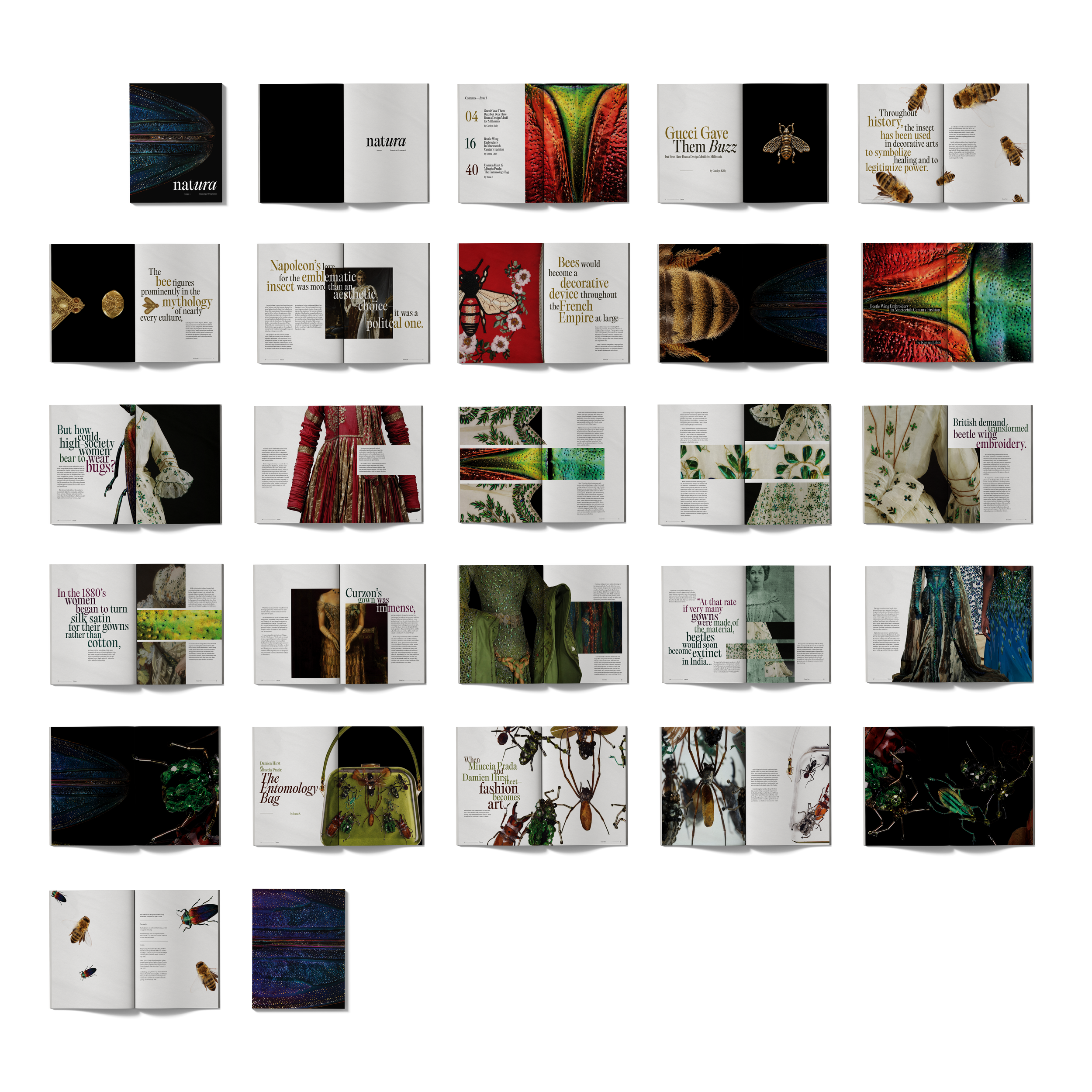 With Issue 01: Insect as Ornament, Natura explores the intersection between nature and fashion. Combing the usage of macro-photography, art history images and fashion photography, the strong visual language provides an engaging reading experience.