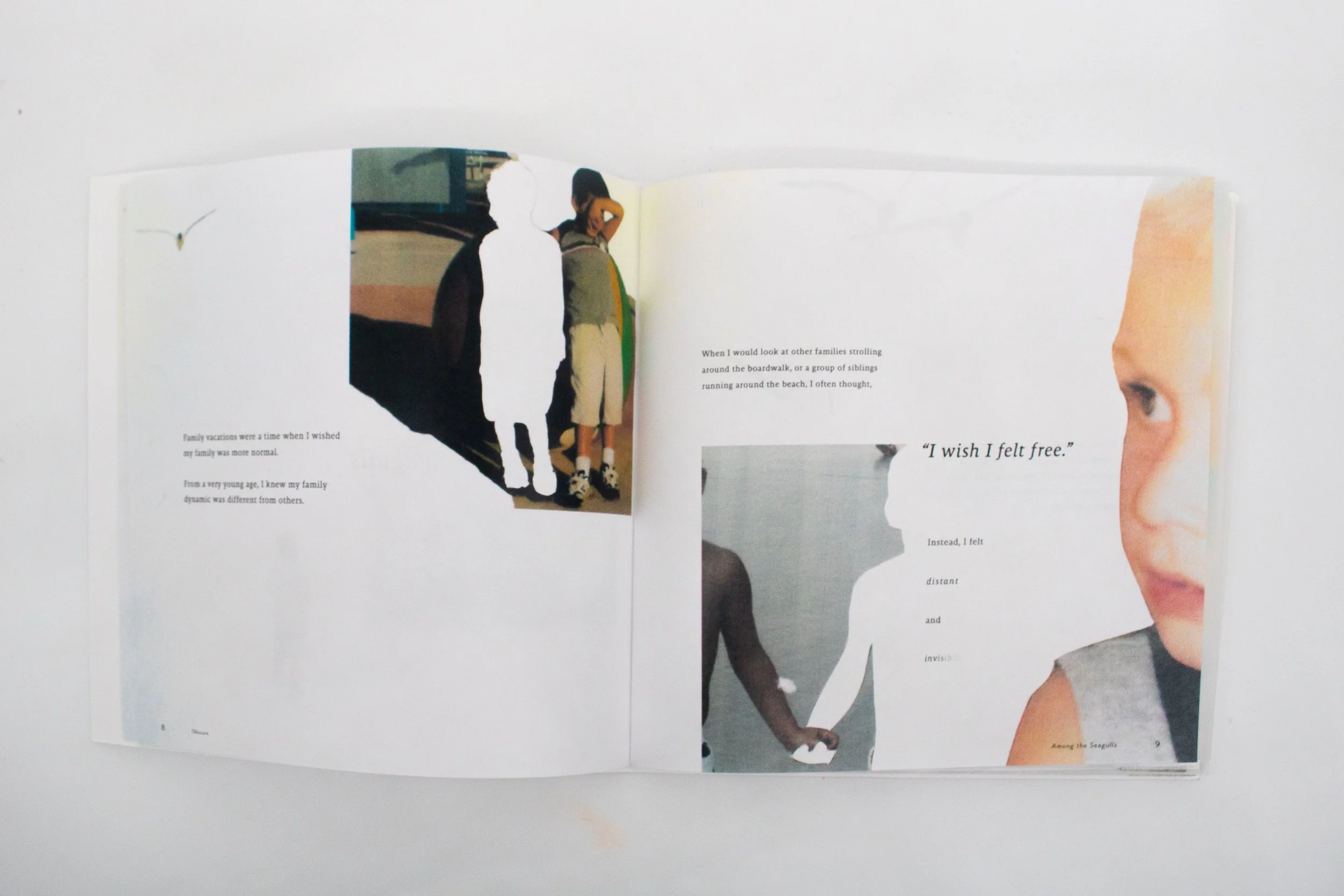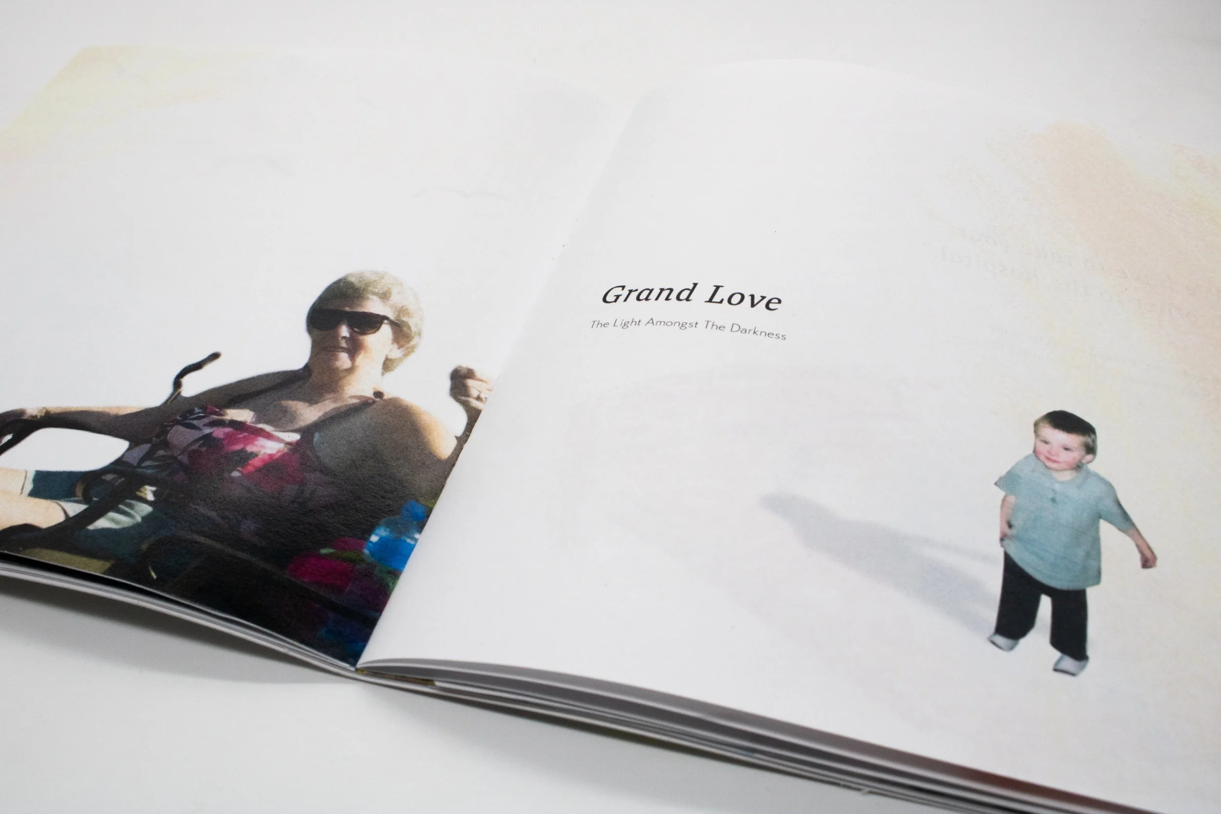 Within the book, I wanted the layouts be intentionally restrained in order for the viewers experience to be reflective and emotional. I relied on using positive and negative space with my layouts and to find a balance between imagery and typography to prevent visual noise.