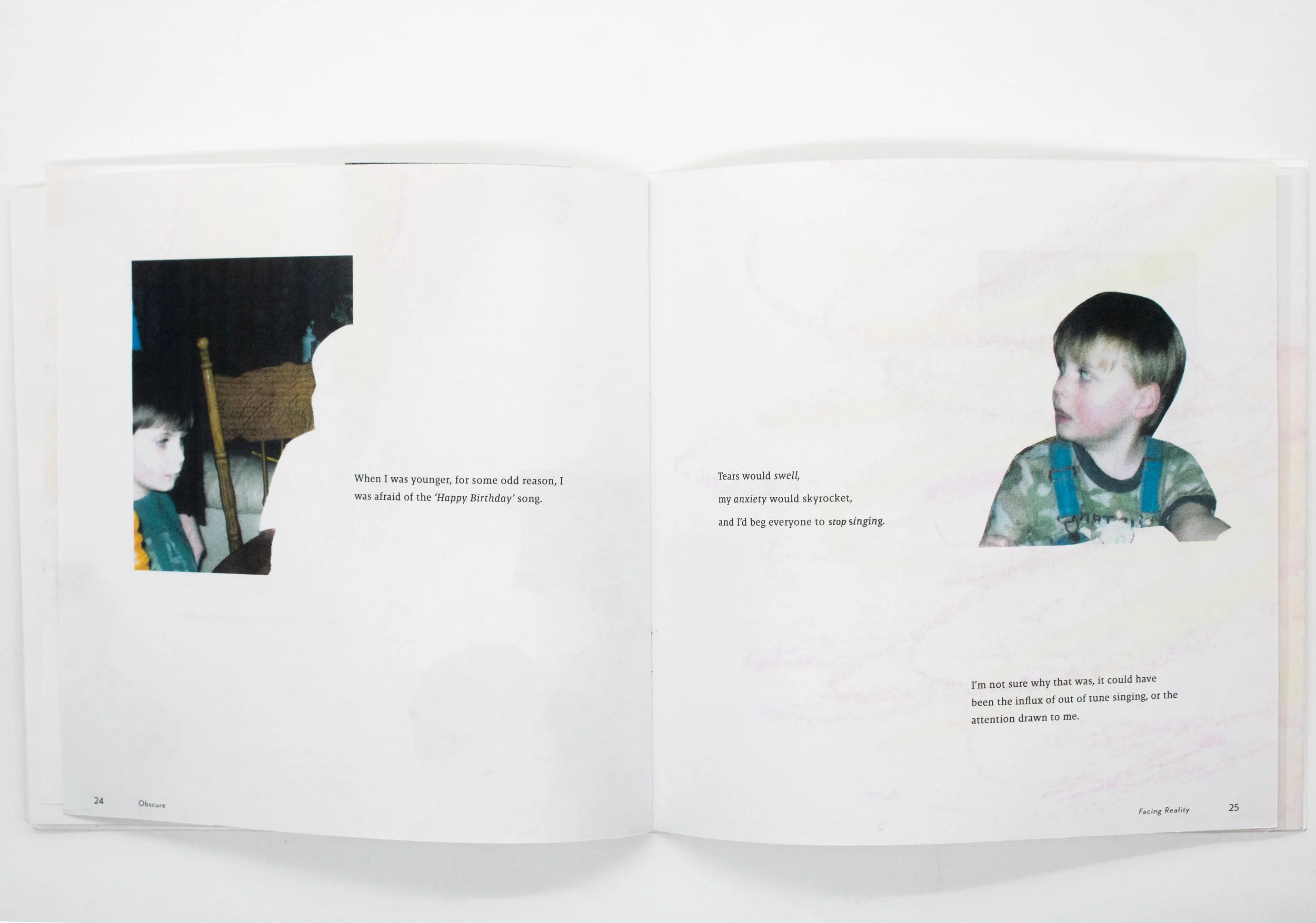 Obscure, my BFA senior thesis, brings up the topic of glass child syndrome, which is a sibling of someone who is disabled. At times, they can feel invisible and unrepresented. By sharing my personal experience as a glass child, I ask: in what ways can I use multi-sensory design to validate and reveal the invisible thoughts of a glass child, educating families and mental health professionals?